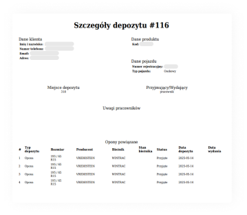Możliwość wydruku karty depozytu opon ułatwia obsługę klienta. Klient ma czytelny dokument potwierdzający fakt pozostawienia lub odebrania opon z depozytu, co poprawia jakość obsługi i buduje zaufanie. Taki dokument to również zabezpieczenie dla Ciebie – w przypadku ewentualnego sporu z klientem masz jasne, jednoznaczne potwierdzenie warunków przechowania opon, co zwiększa Twoje bezpieczeństwo i chroni przed nieporozumieniami. Dodatkowo możesz wygenerować etykiety, które przyklejasz na zdeponowane opony. Dzięki temu szybko je zidentyfikujesz i bez problemu odnajdziesz w magazynie. Oszczędzasz czas podczas sezonowych wymian czy serwisu.